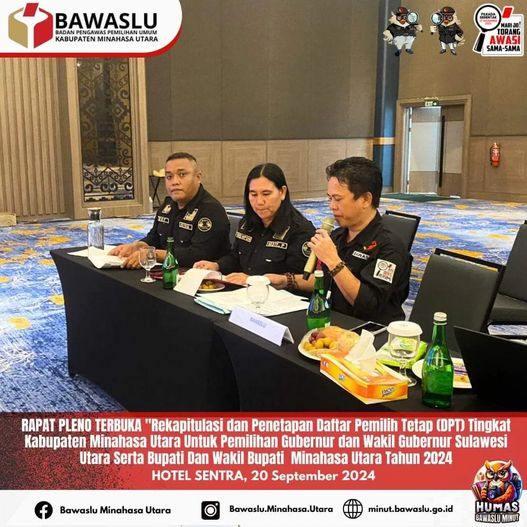 Koordinator Divisi P3S Bawaslu Kabupaten Minahasa Utara Waldi Mokodompit, mengikuti RAPAT PLENO TERBUKA "Rekapitulasi dan Penetapan DPT Tingkat Kabupaten Minahasa Utara Untuk Pemilihan Serentak Tahun 2024, Bertempat Di Hotel Sentra, Jumat 20/09/ 2024