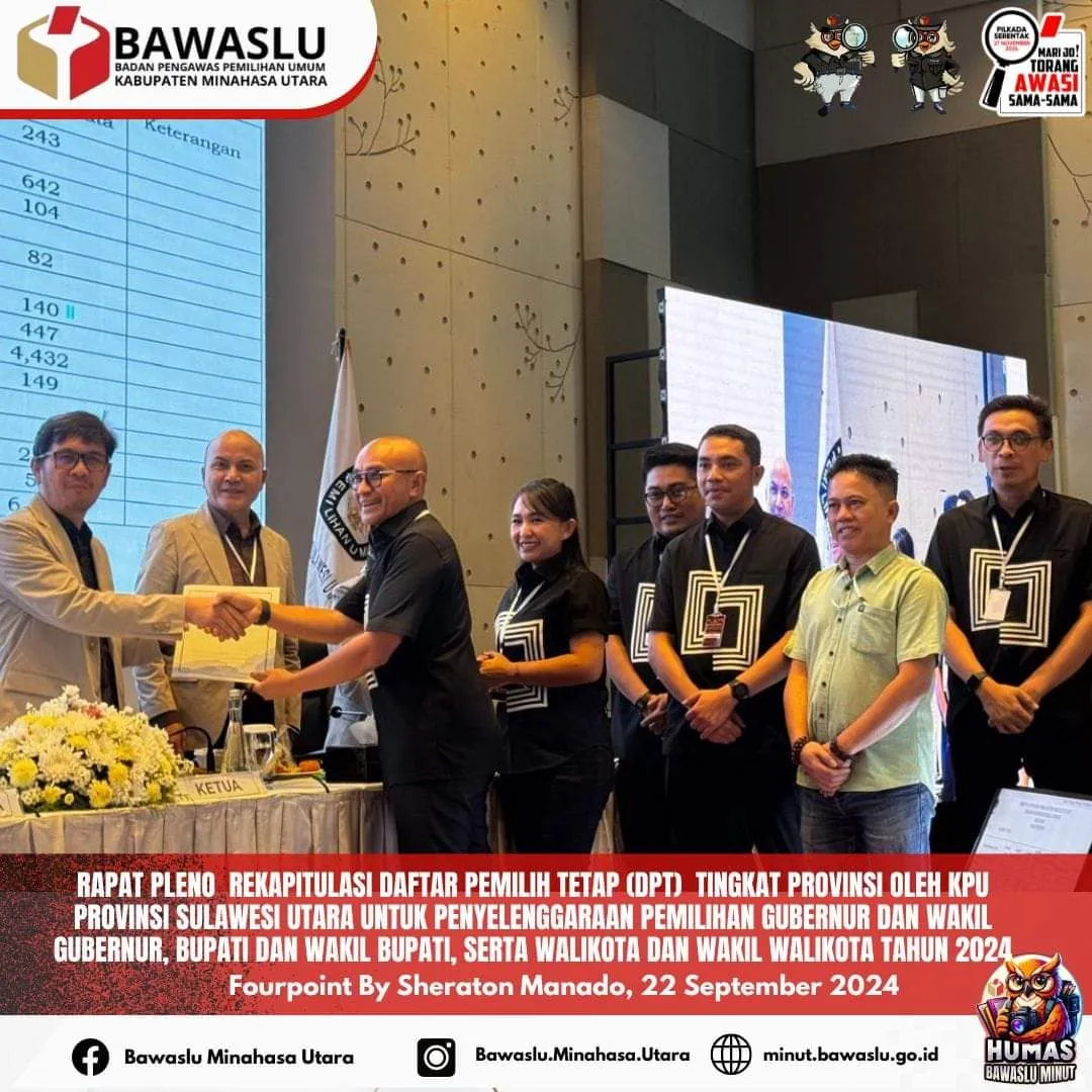 Koordinator Divisi P3S Bawaslu Kab.Minahasa Utara Waldi Mokodompit, mengikuti Rapat Pleno Rekapitulasi DPT Tingkat Provinsi Oleh KPU Provinsi Sulawesi Utara Untuk Pemilihan Serentak Tahun 2024 Bertempat Di Fourpoint By Sheraton Manado, (22 /09/2024)