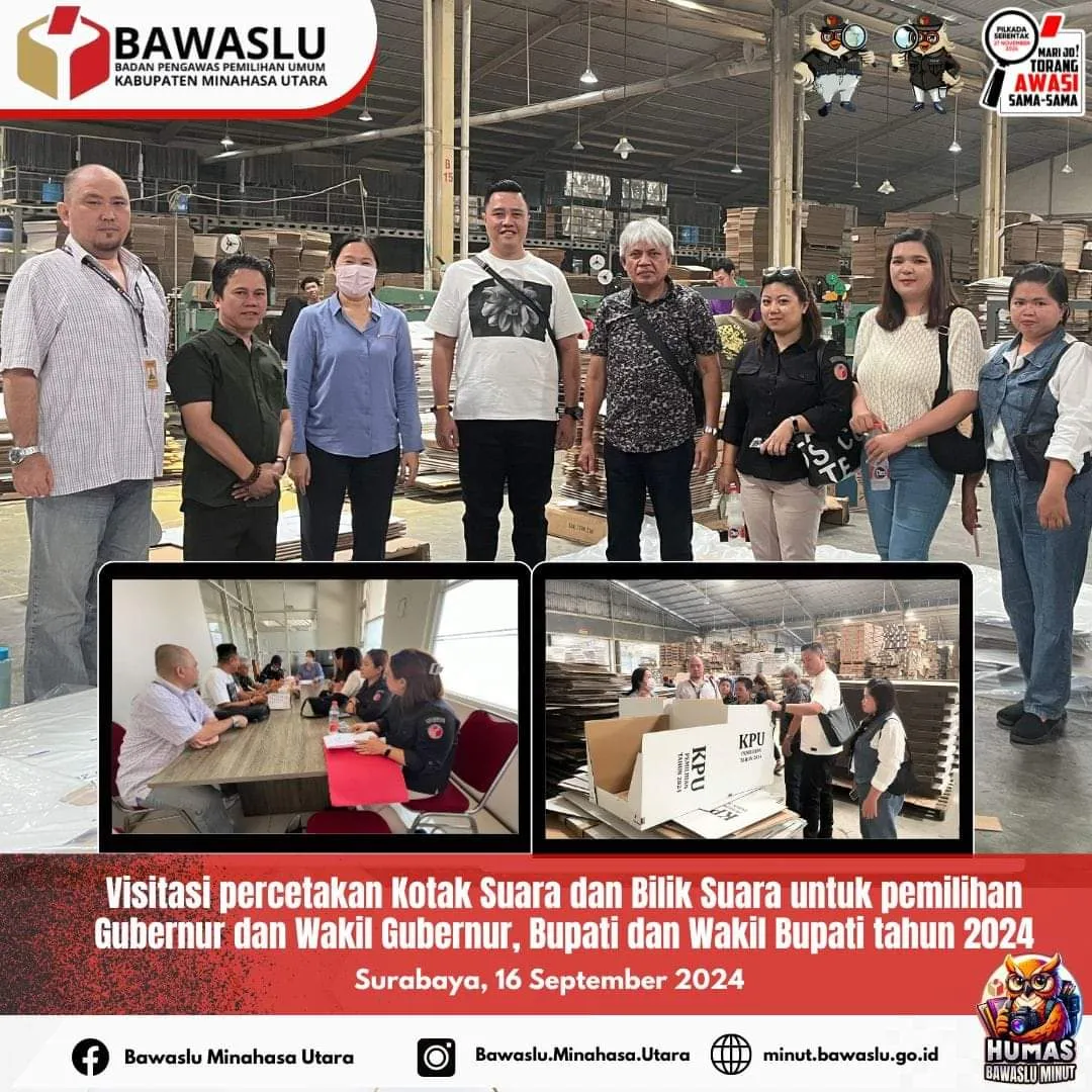 Ketua Bawaslu Kabupaten Minahasa Utara Rocky Marciano Ambar, Koordinator Divisi Penanganan Pelanggaran Dan Penyelesaian sengketa Waldi Mokodompit, dan Staf Melaksanakan Visitasi percetakan Kotak Suara dan Bilik Suara untuk pemilihan Gubernur dan Wakil Gu