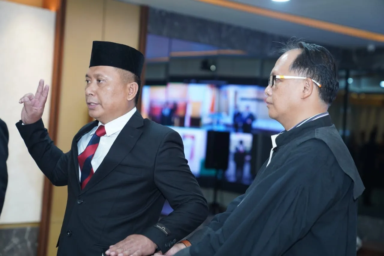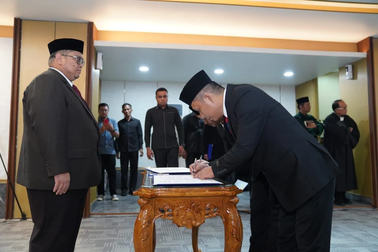 Ketua Bawaslu RI Rahmat Bagja melantik sekaligus mengambil sumpah jabatan Pengganti Antar-Waktu (PAW) Anggota Bawaslu Kabupaten Minahasa Utara, Simon Herman Awuy, bertempat di Gedung Bawaslu, Jakarta, Sabtu (21/9/2024)